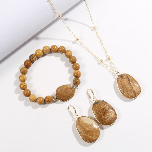 Gold Chain Necklace Natural Stone Bracelet Earrings Women's Jewelry Set